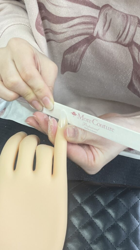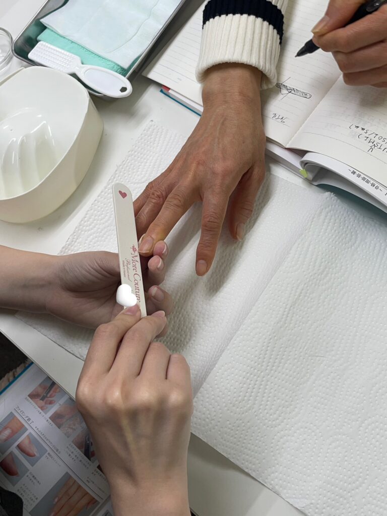 エメリーボードを使用し、爪の長さや形を整える工程です