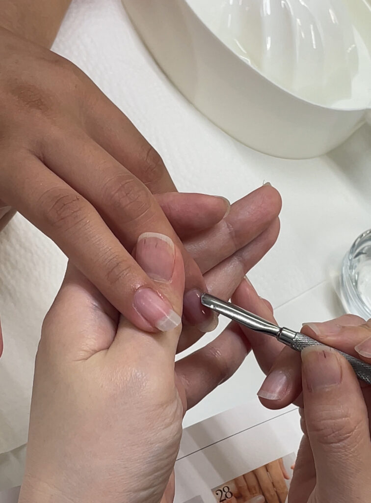 爪まわりの甘皮や角質を取り除き、清潔な状態にする下処理の工程です
